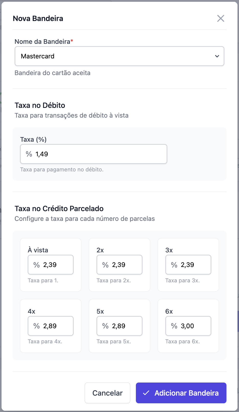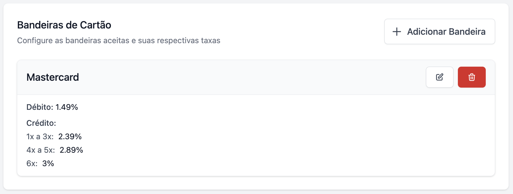 Faça esse processo para todas as bandeiras que são aceitas pela sua loja, de acordo com suas taxas contratadas na maquininha (Ex: Mastercard, Visa, Elo, Amex, etc).