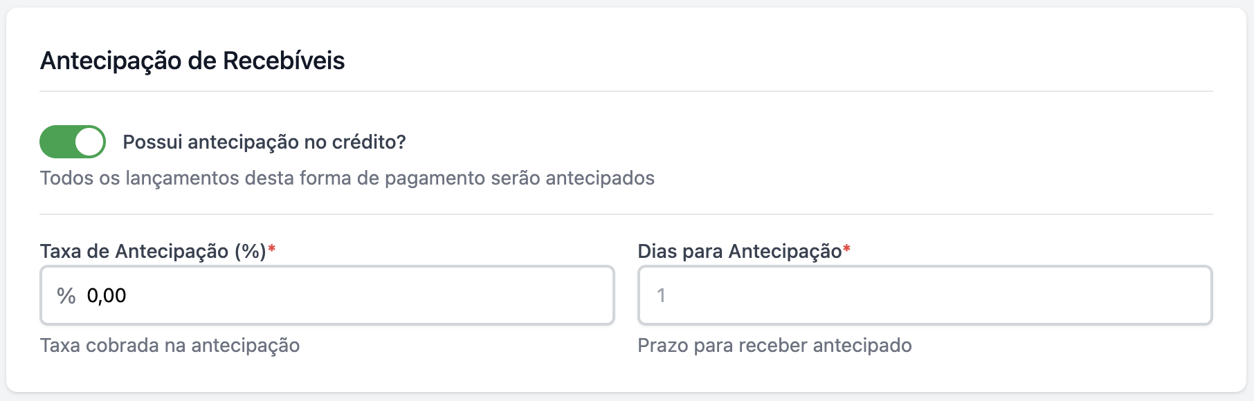 Caso você possua contratado a antecipação automática dos recebimentos no cartão de crédito, ative essa opção. Será necessário você informar a Taxa de antecipação, definida no seu contrato com a maquininha e a quantidade de dias para antecipação.