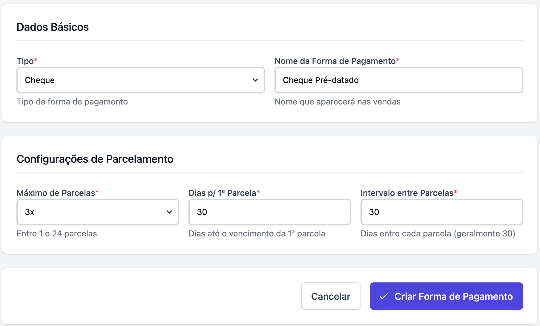 Nome da forma de pagamento: Defina o nome que aparecerá no Ponto de vendas. Exemplo: Cheque à vista, Cheque pré-datado, etc.