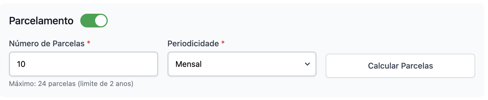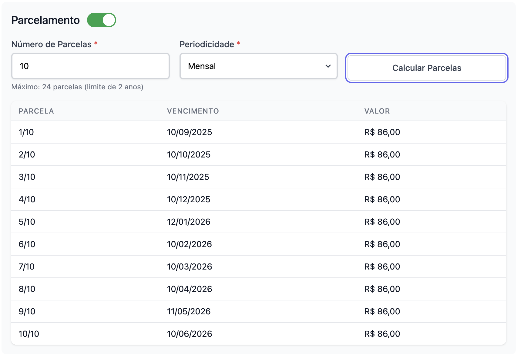 Caso queira simular o valor e vencimento de cada parcela, clique em "Calcular parcelas". Assim, conseguirá ver cada vencimento e valor.