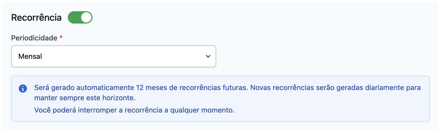Serão gerados lançamentos futuros da despesa em um período de 1 ano. Ou seja, se a recorrência for mensal, serão gerados 12 lançamentos para a despesa, mantendo a projeção futura sempre atualizada, com o mínimo de 12 meses.