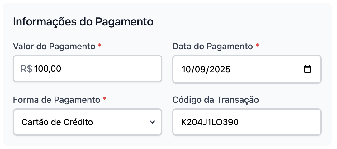 Valor do pagamento (obrigatório): Valor pago da despesa. Caso selecionado um valor menor do que a despesa efetiva, o lançamento ficará com o status de "Pago parcialmente"