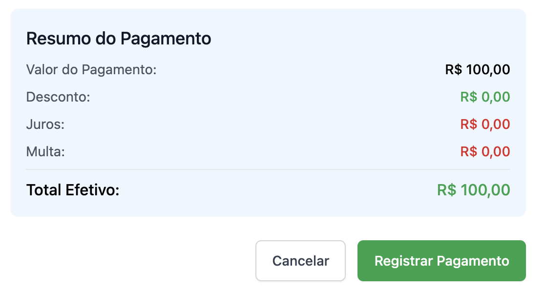No final, basta conferir o resumo do pagamento e, estando tudo certo, basta clicar em "Registrar pagamento".
