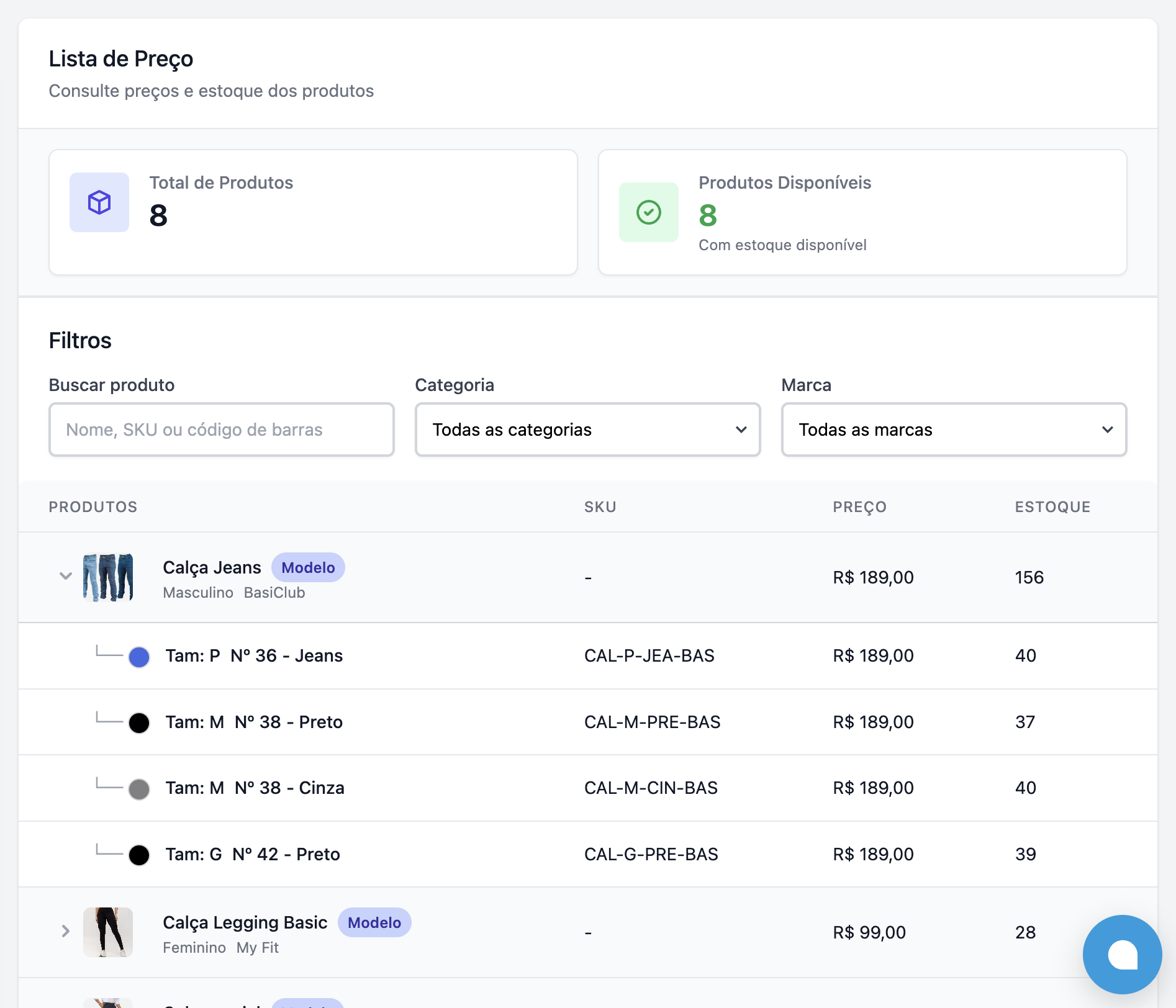 As informações de Preço e Estoque poderão ser visualizadas em cada produto. Tanto o estoque total quanto o estoque em cada variação de peça.