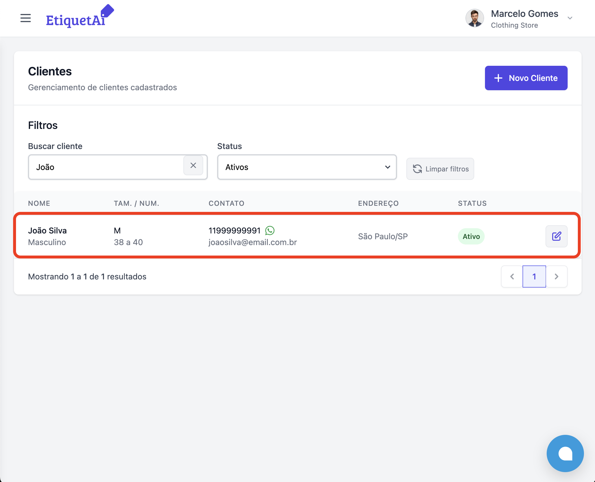 Após localizar, basta clicar no registro deste cliente para visualizar todos os seus dados: