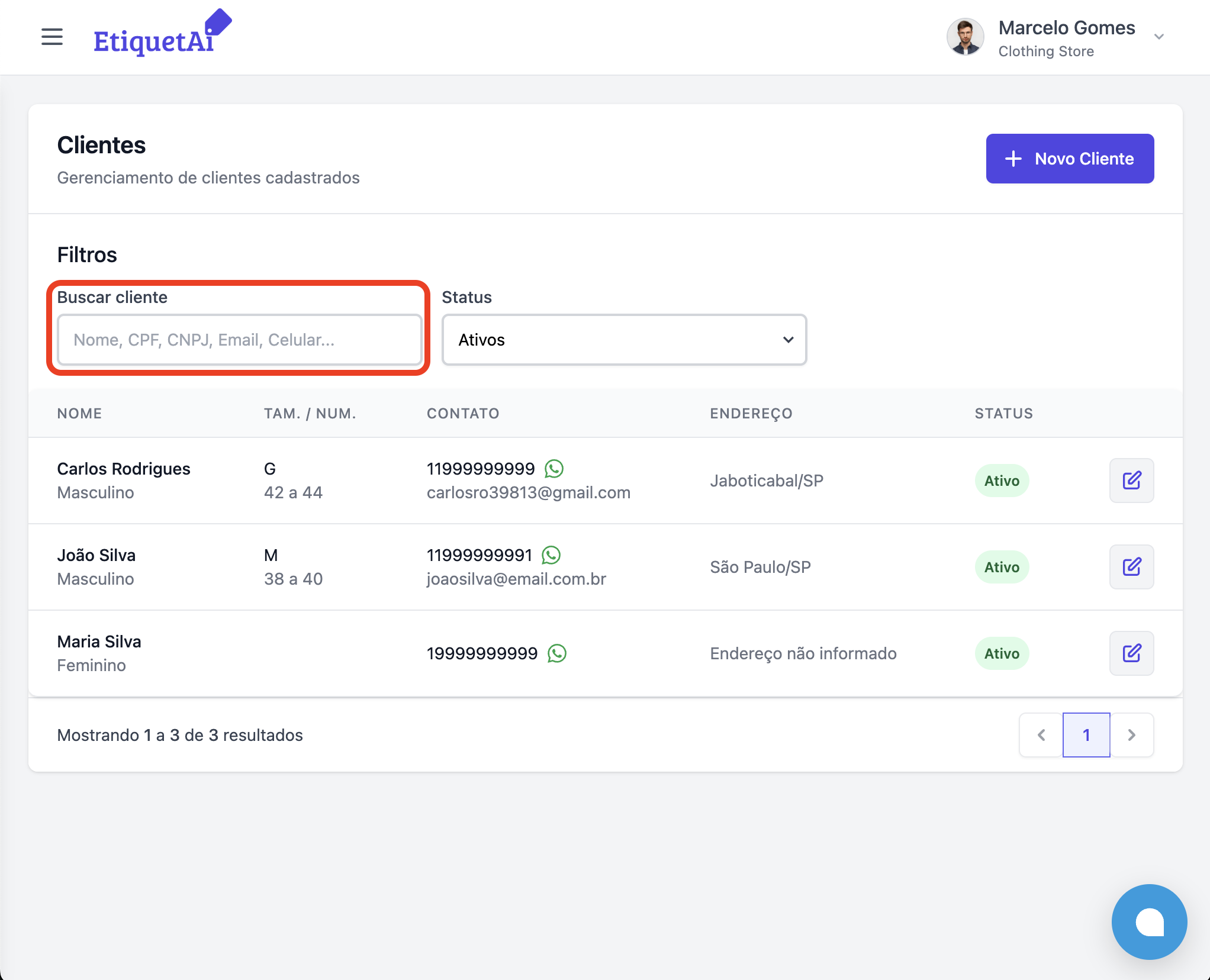 Para começar, você deve acessar o menu "Clientes". Ao acessar, pesquise pelo cliente que deseja conferir através do campo em destaque abaixo. Você pode pesquisar pelo Nome, CPF, CNPJ, E-mail ou Celular do cliente.