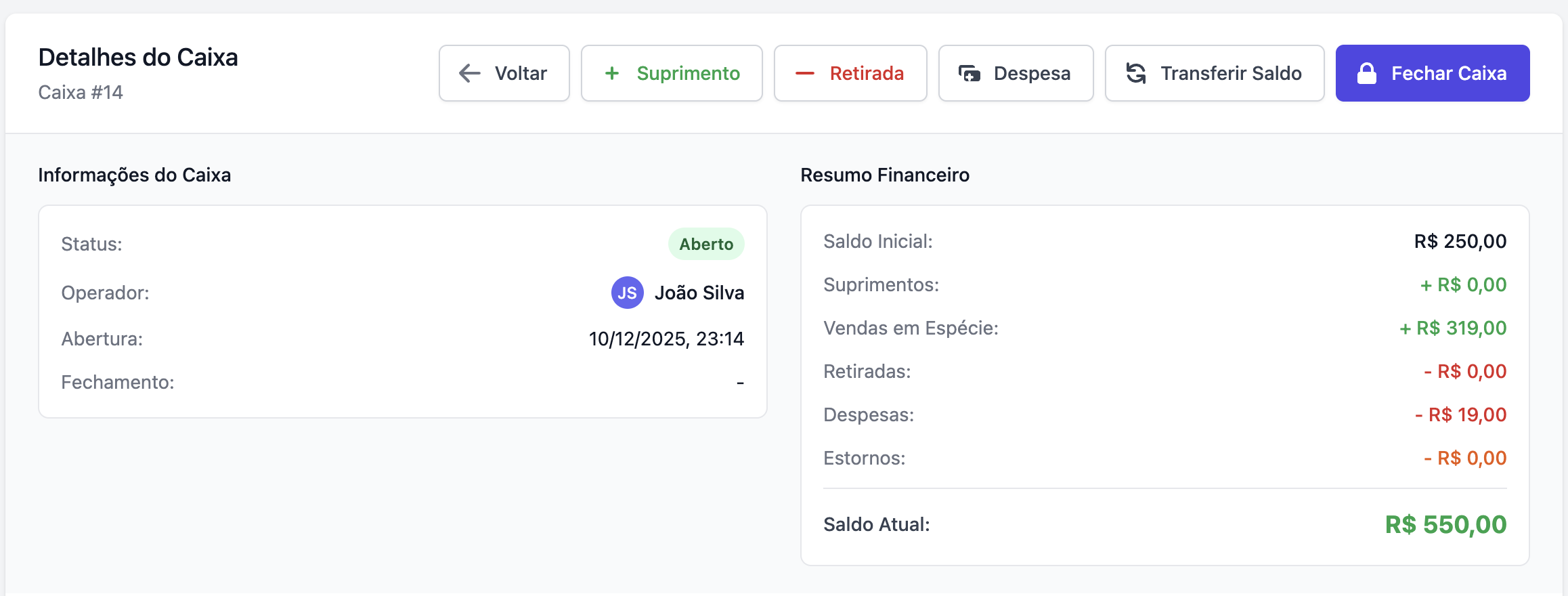 Logo no início dos detalhes do caixa, você terá o resumo completo, inclusive o Saldo atual do caixa.