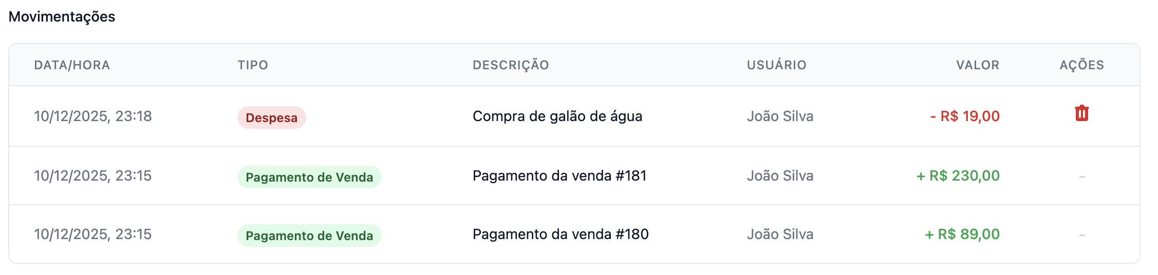 Nesta seção, você verá tudo que movimentou o saldo do caixa. Ou seja, todas as movimentações em espécie, como: