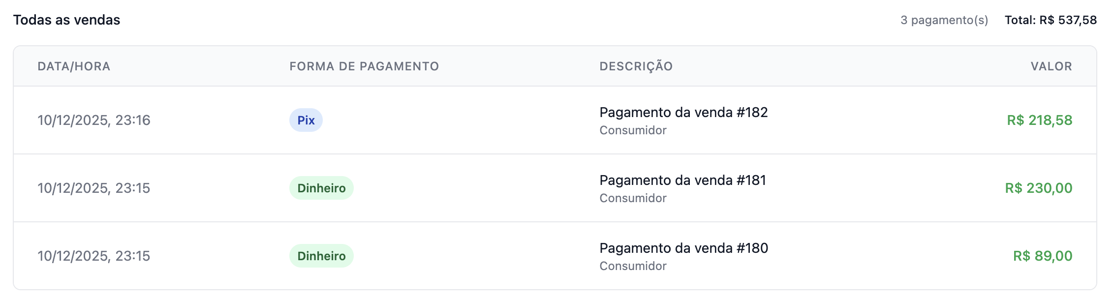 Já nesta seção, você verá todas as vendas que foram vinculadas ao caixa. Inclusive vendas que não foram pagas em espécie. Essa é a forma mais fácil de conferir se os pagamentos das vendas do dia foram registrados corretamente no EtiquetAi, comparando com o saldo do caixa, comprovantes de pagamento da maquininha, Pix recebidos na conta, etc.