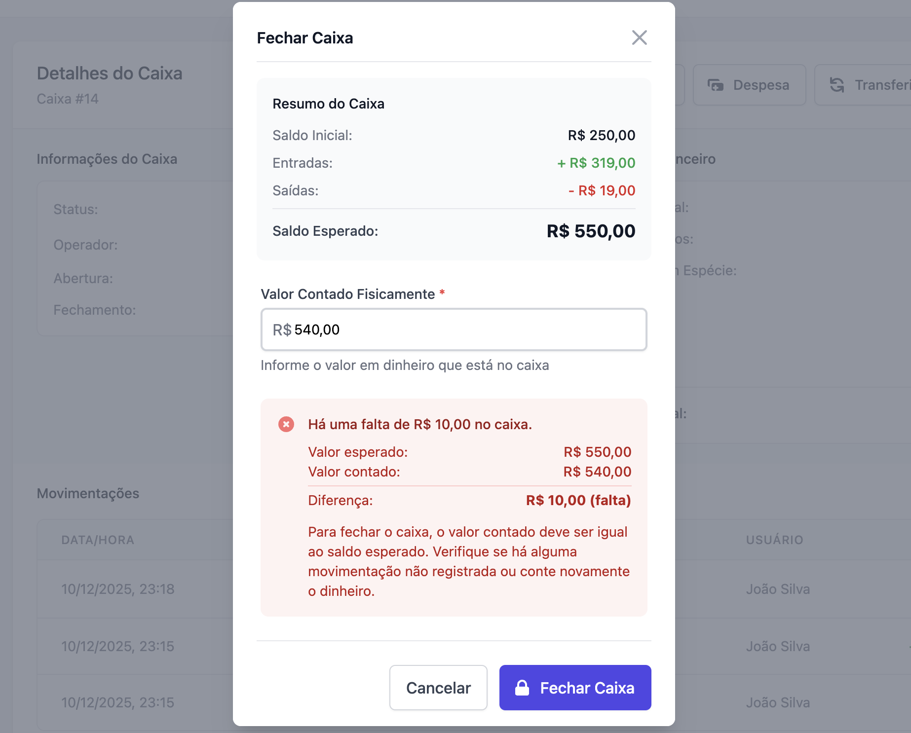Caso haja diferença entre o saldo físico e o saldo do caixa no sistema, o sistema irá alertar, informando o valor que falta ou o valor excedente, veja um exemplo abaixo: