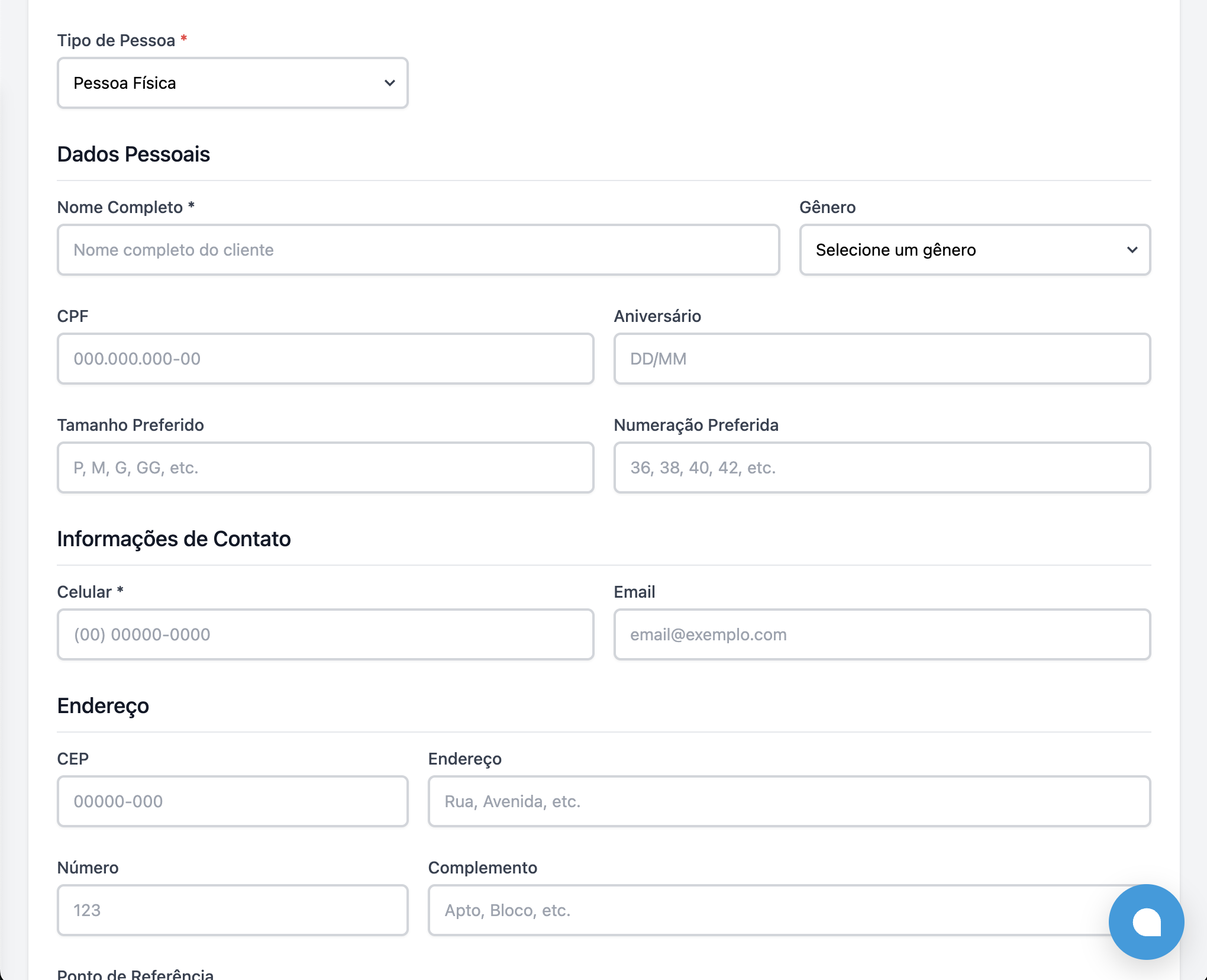 Ao clicar, você verá o formulário com todos os campos dos clientes como Nome, Celular, Cpf, Preferências de tamanho e numeração, endereço, etc.