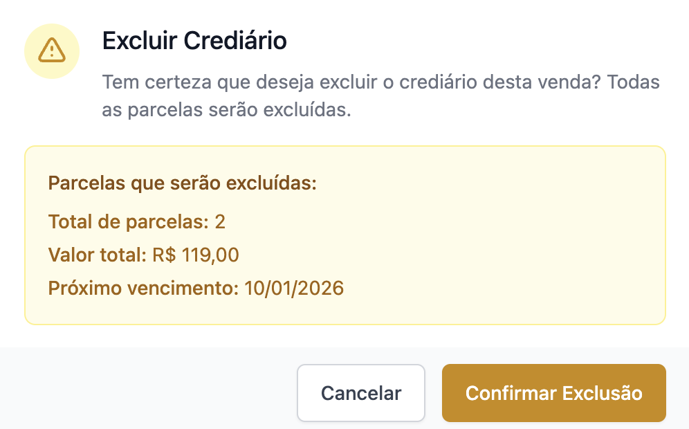 Após clicar em "Excluir Crediário", basta confirmar a exclusão: