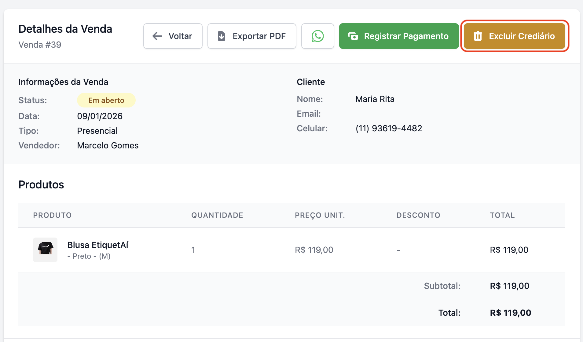 Ao acessar a venda, você verá na parte superior o botão "Excluir crediário", que excluirá o crediário, mantendo a venda em aberto.