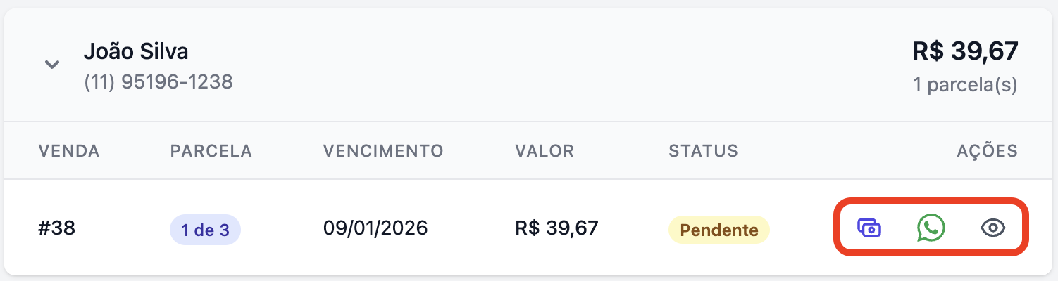 Para cada parcela do crediário, você pode executar algumas ações, como: