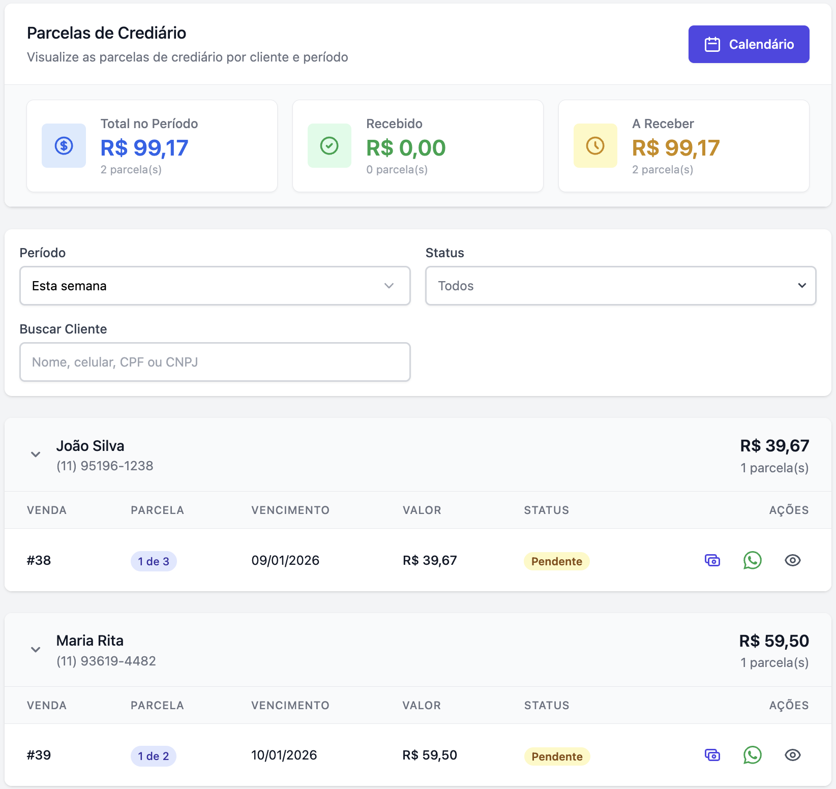 A listagem é organizada de acordo com os clientes que possuem crediários vencendo no período filtrado. Para facilitar buscas específicas, você pode filtrar clientes, período ou status do crediário.