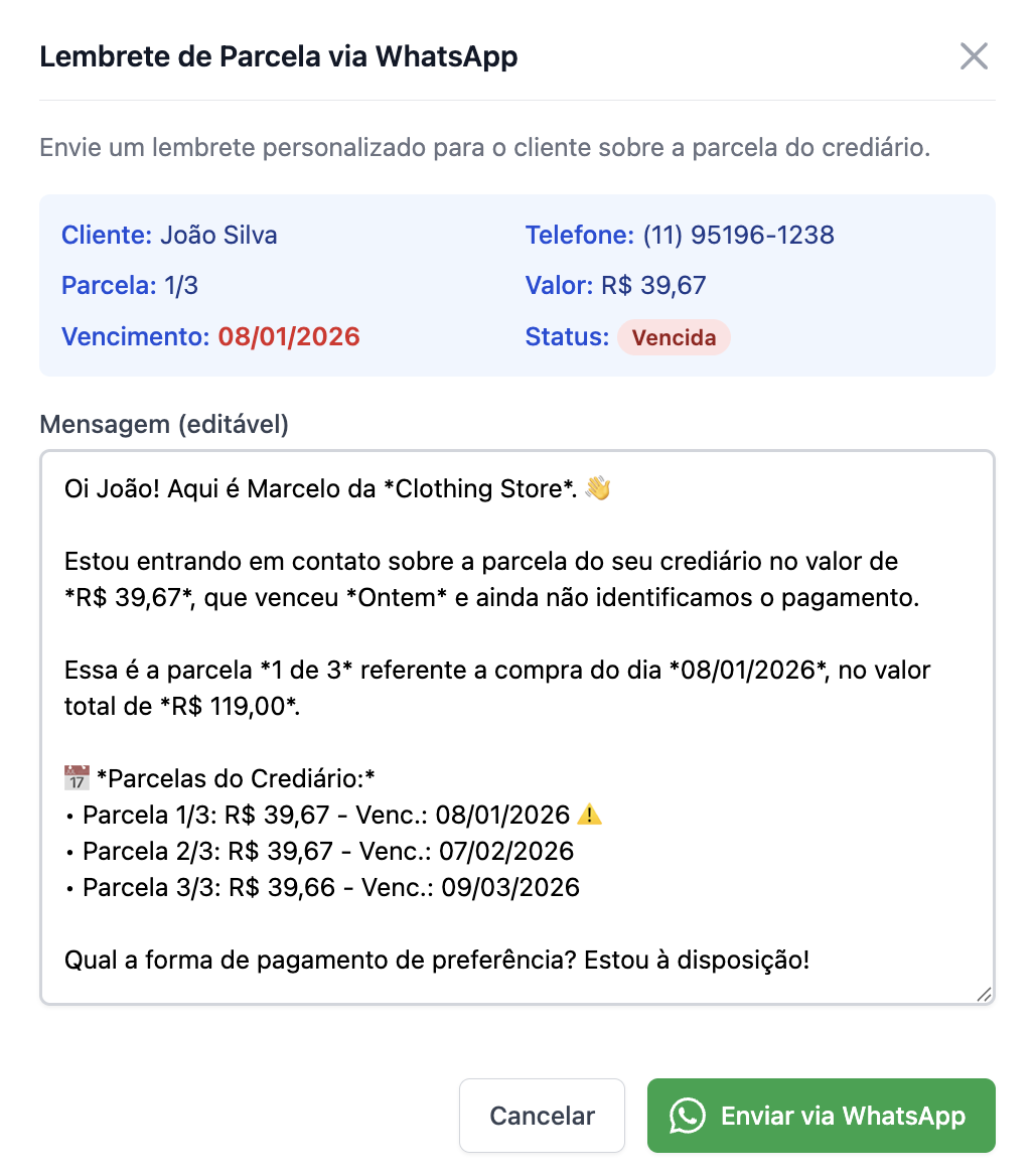 Ao clicar no ícone de WhatsApp na parcela, o sistema irá gerar uma mensagem automática com os dados da venda e do crediário para que você possa encaminhar ao cliente.