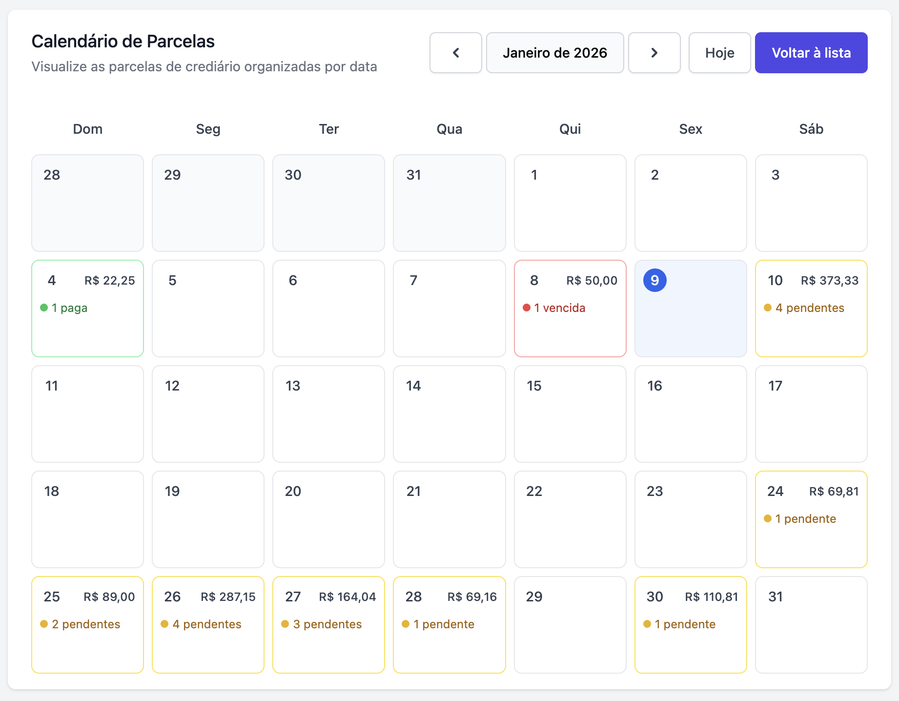 Ainda na tela de gestão e acompanhamento das parcelas do crediário, caso queira ter uma visão rápida dos recebimentos previstos para o mês, você pode acessar a visão de Calendário.