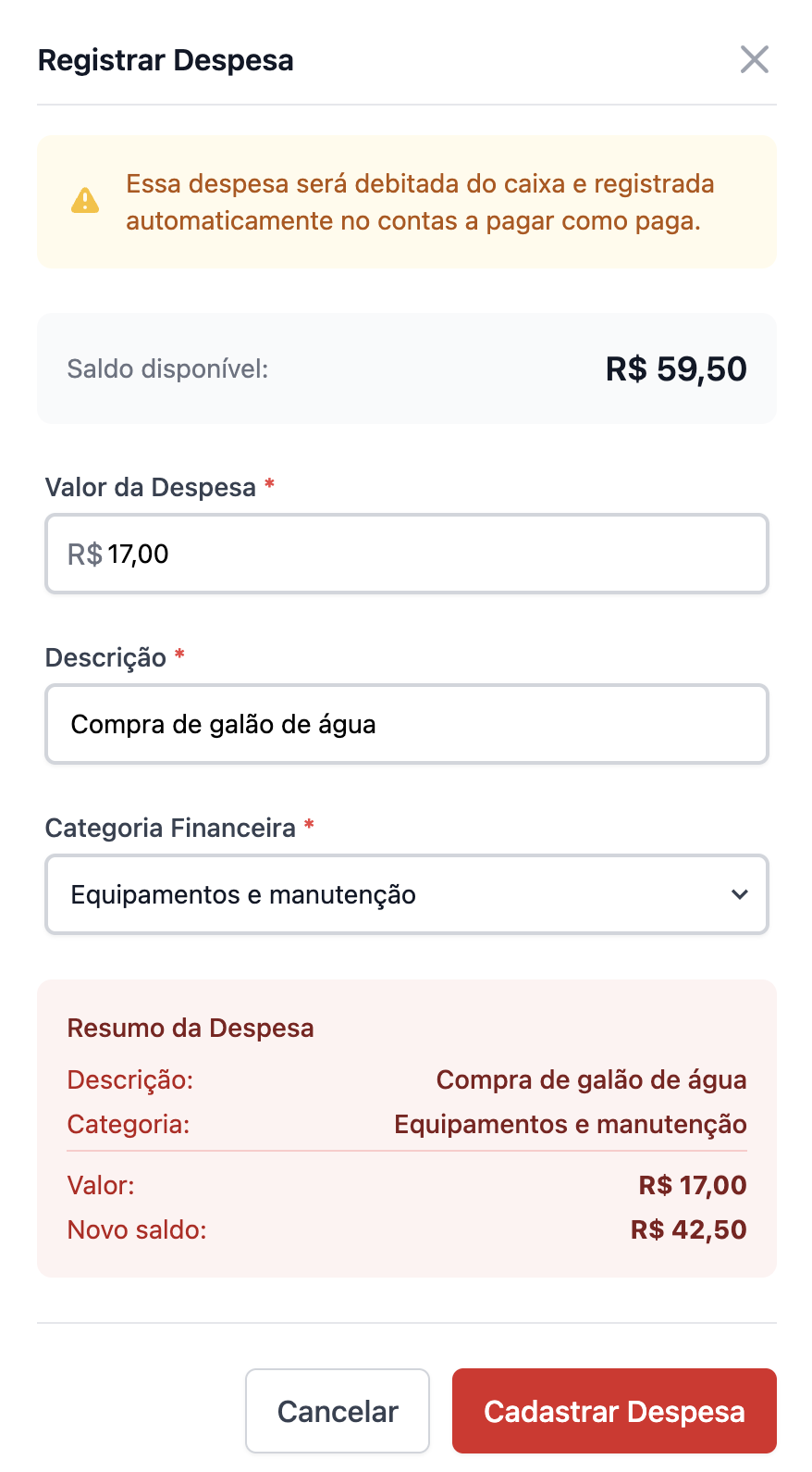 Ao registrar uma despesa pelo caixa, essa despesa será automaticamente integrada ao seu financeiro, no Contas a pagar. Essa despesa será criada com o status "Paga", com a forma de pagamento "Dinheiro" e na categoria conforme escolhida.
