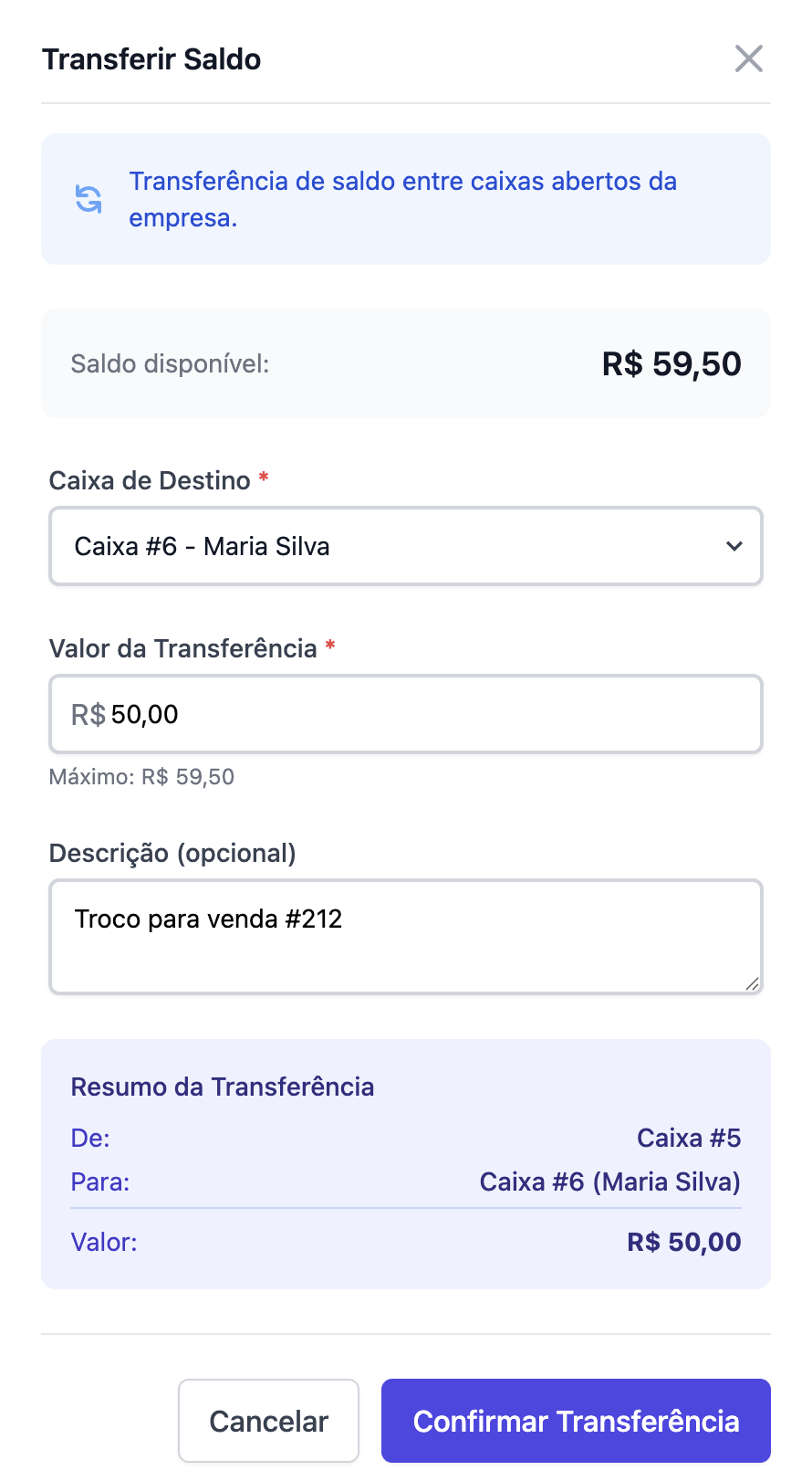 Transferência de saldo: Essa movimentação ocorre quando há mais de um caixa aberto na empresa. Quando um venda em espécie é registrada em um caixa que está sem troco, você pode transferir o saldo de um caixa para outro, mantendo a consistência do que fisicamente acontece.