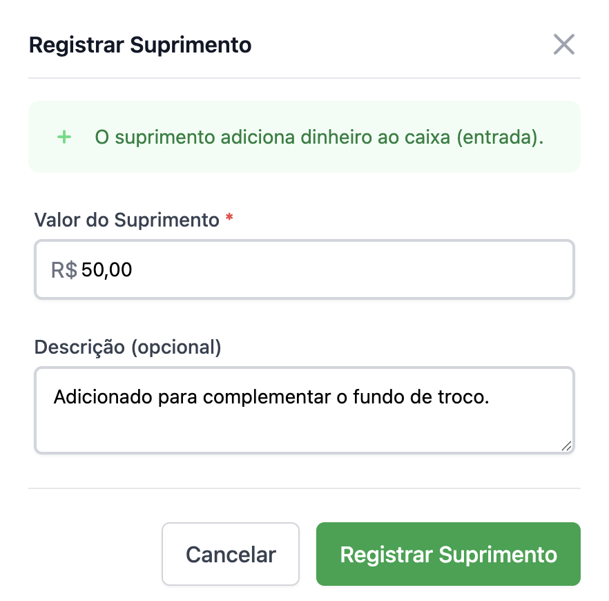 Suprimento: Essa movimentação refere-se a injeção de dinheiro (espécie) em caixa. Pode ser necessário para garantir o troco de vendas caso o saldo inicial ou pagamento de alguma despesa com o saldo do caixa.