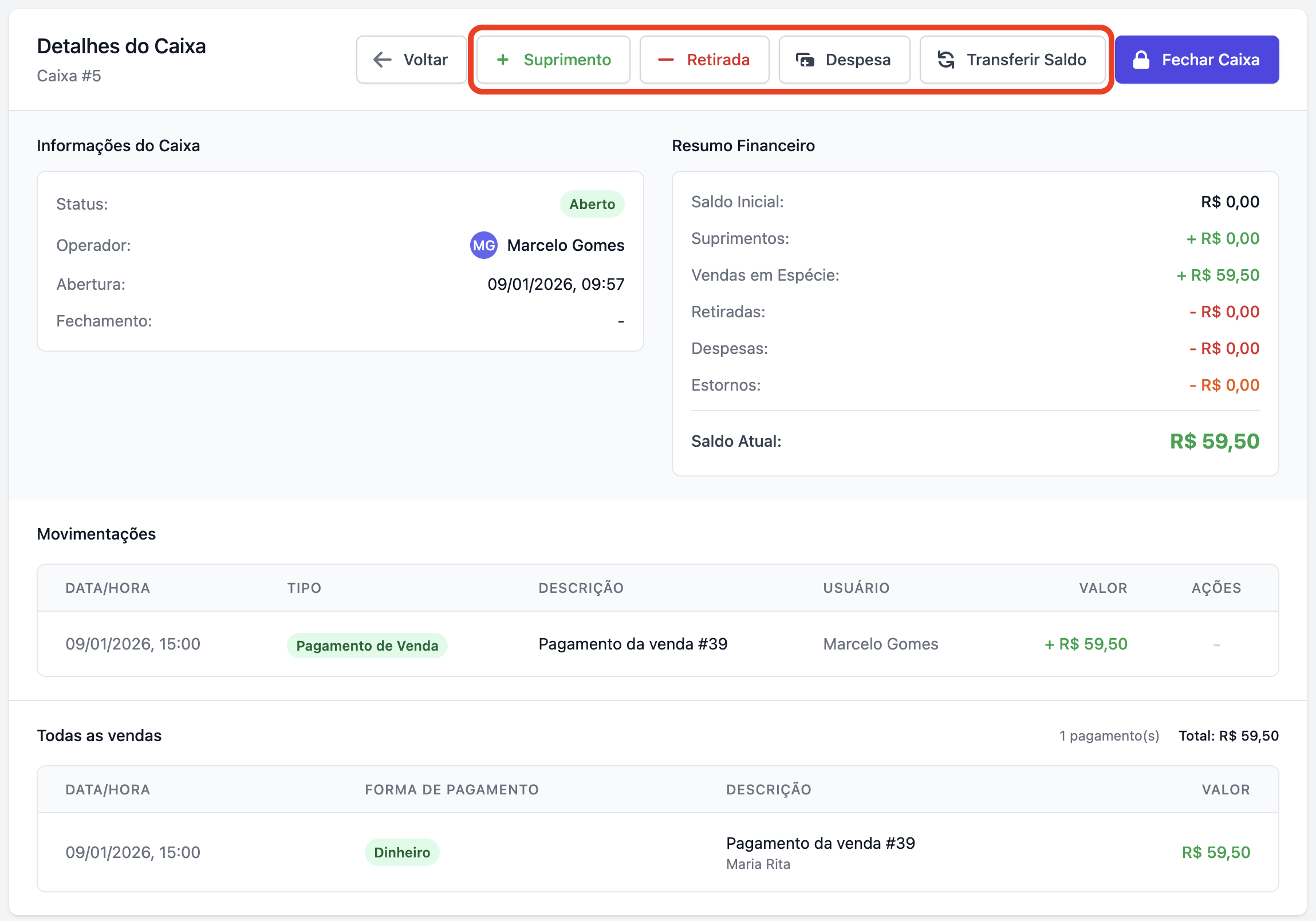 Todas as ações de movimentação podem ser feita no topo da visualização do caixa, veja no exemplo abaixo: