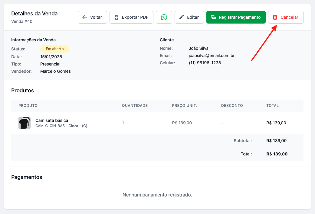 Importante: A ação de cancelar uma venda é irreversível.