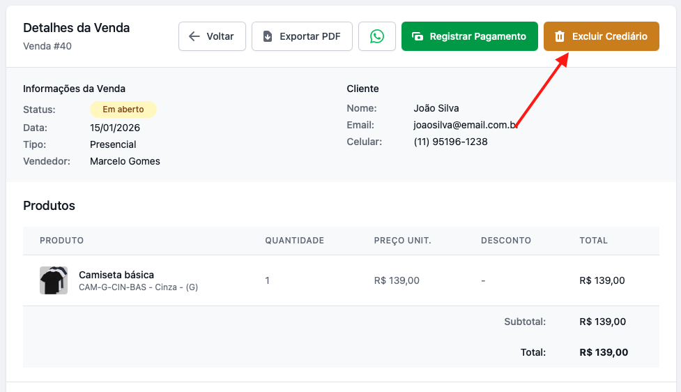 Importante: Caso alguma parcela do crediário já esteja paga, será necessário remover o pagamento das parcelas antes de excluí-lo.