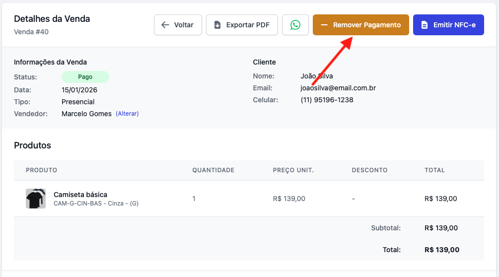 Ao remover o pagamento, a venda retornará para o status "Em aberto" e a ação para Cancelar venda estará disponível novamente.
