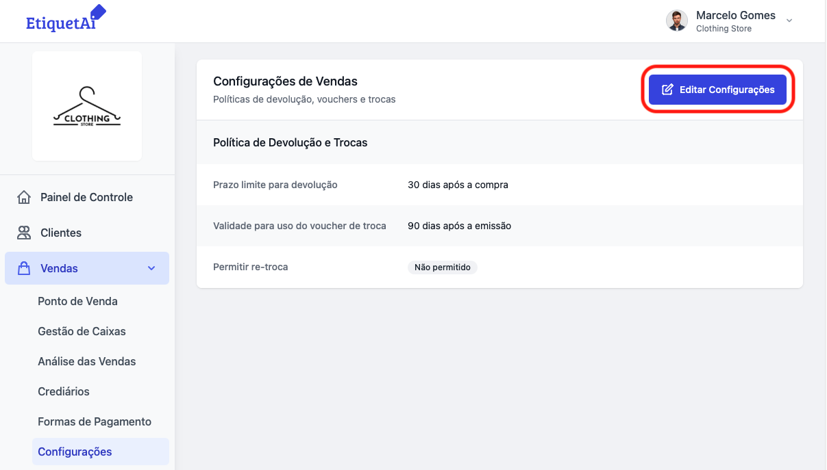 Os prazos para troca e devolução podem ser definidos através do menu Vendas > Configurações.