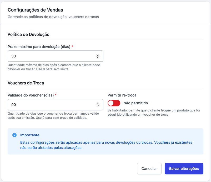 Importante: As definições feitas serão aplicadas apenas para novas devoluções ou trocas. Vouchers de troca já existentes não serão afetados pelas alterações, por exemplo.