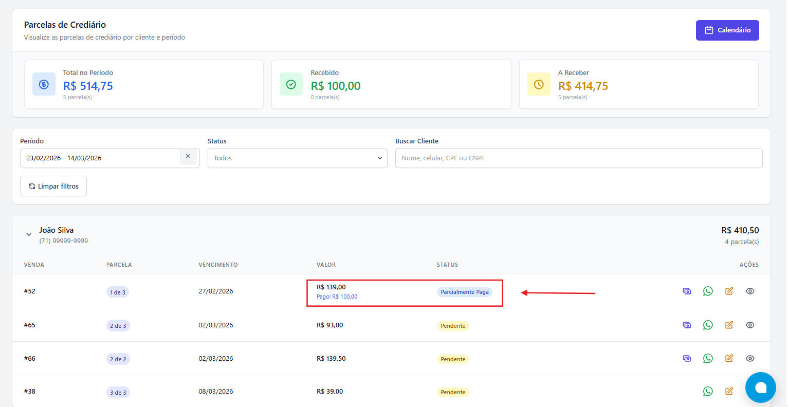 Ao registrar os pagamentos corretamente, sejam eles totais ou parciais, o sistema garante que os valores fiquem sempre ajustados e que as parcelas sejam pagas na ordem correta.