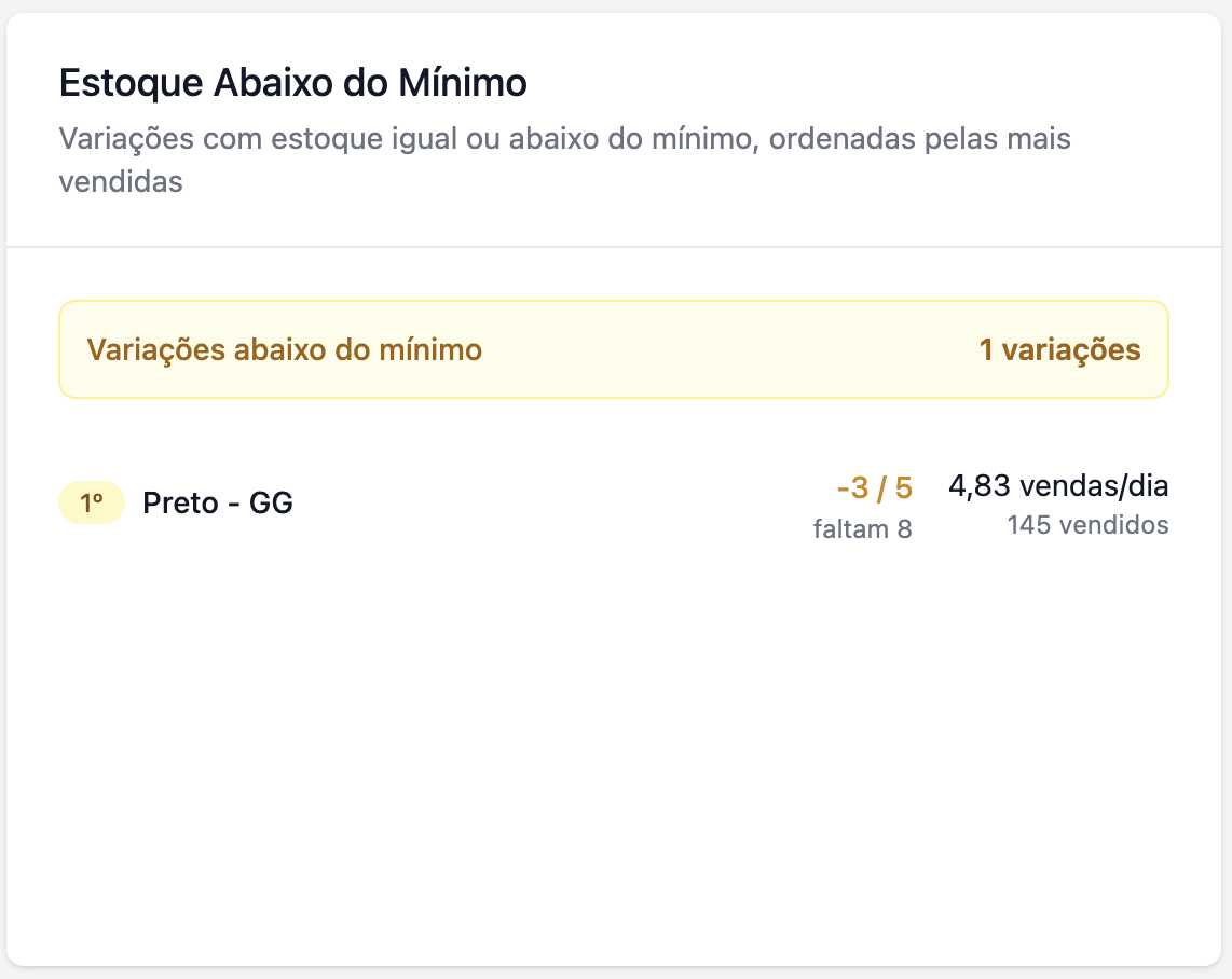 Neste widget, você terá a visão das variações do produto que estão com o estoque abaixo do mínimo definido, ordenados pelas variações mais vendidas do período. Variações no topo podem ter maior risco de falta.