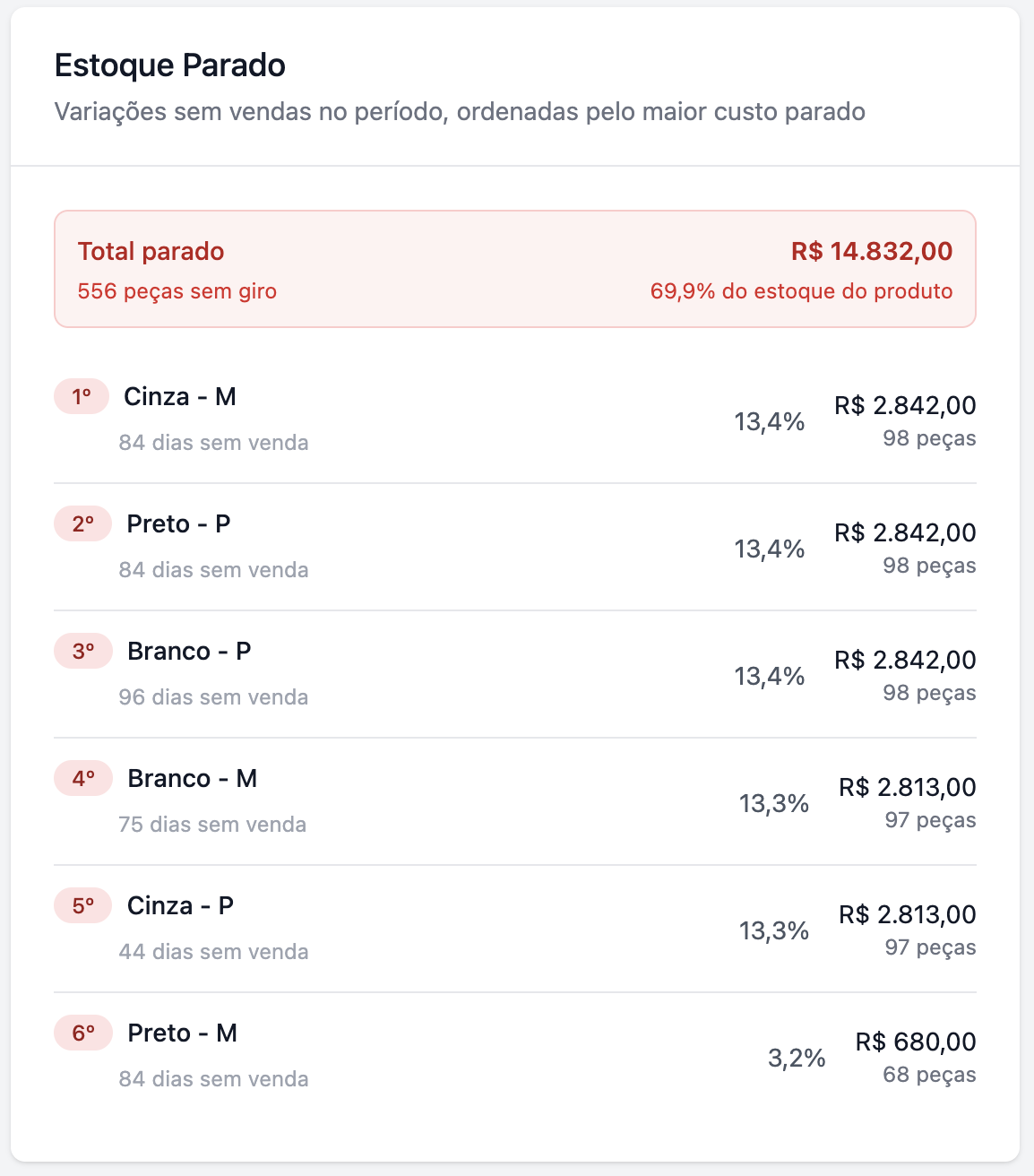Através da análise de estoque individual, é possível entender exatamente a performance de um produto específico e o detalhamento das suas variações.