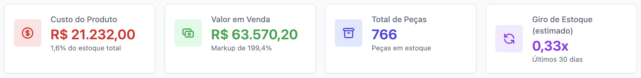 Esse indicador mostra para você qual foi o valor investido naquele produto e o percentual desse custo em relação ao custo total de estoque da loja.