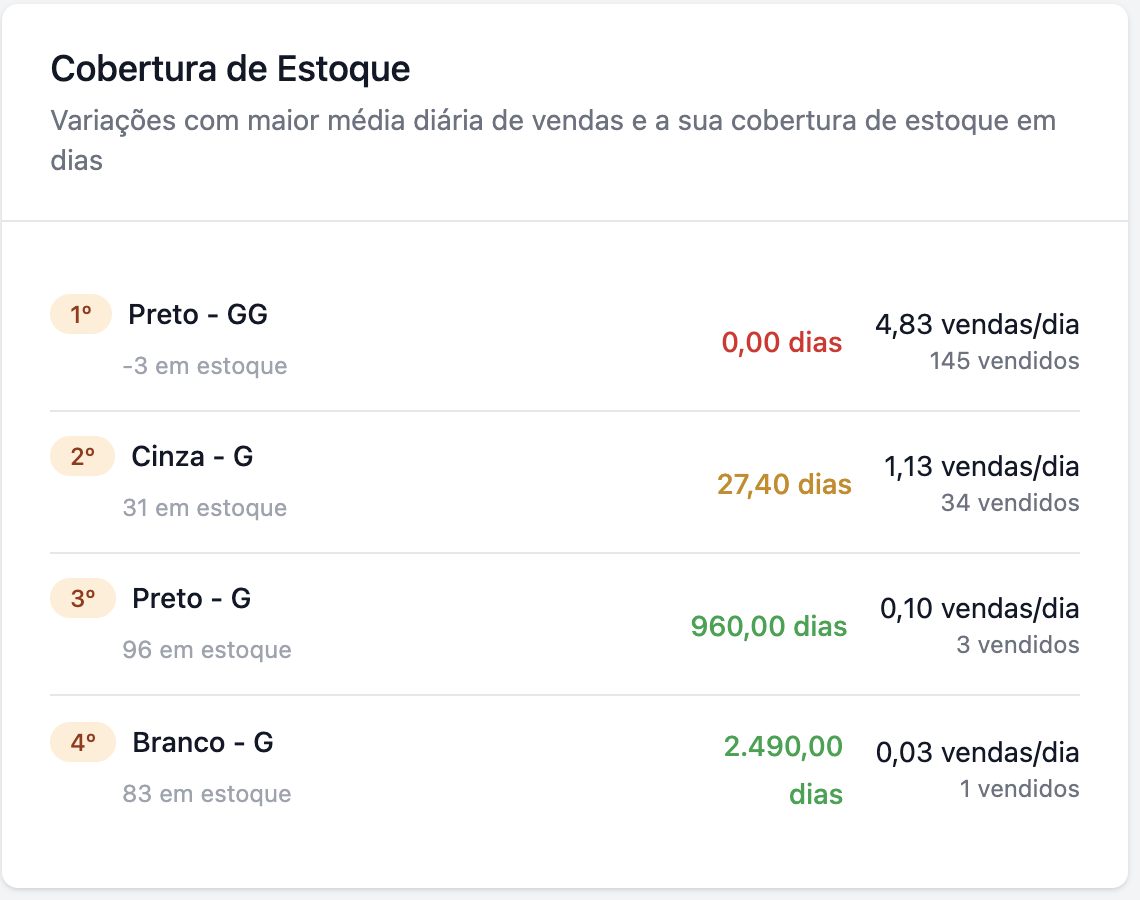 Baseia-se na média de vendas das variações do produto e o seus estoques atuais, para projetar a quantidade de dias de cobertura de estoque. A ordenação dos produtos segue as variações que foram mais vendidas no período.