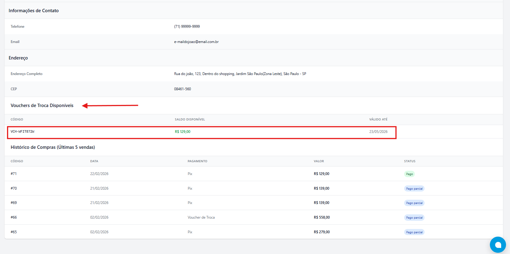 Os vouchers de troca ficam disponíveis diretamente no cadastro do cliente, junto a um atalho de visualização rápida das últimas 5 vendas.