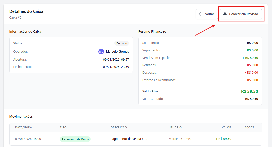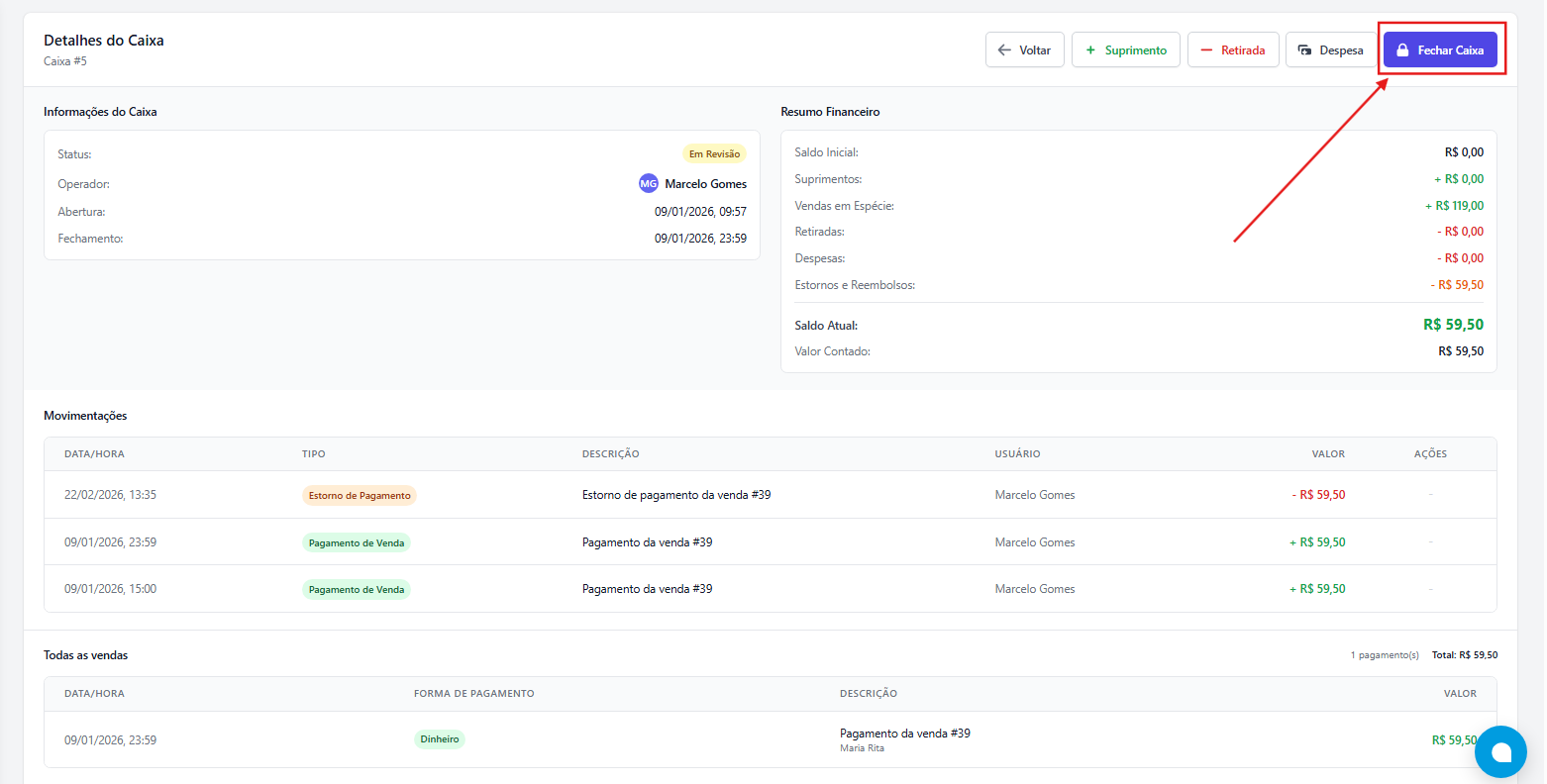 1️⃣ Identifique o caixa onde o pagamento foi registrado