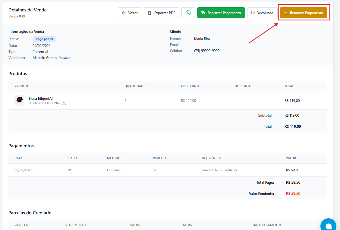 Faça os ajustes necessários (produtos, valores, crediário, etc.)