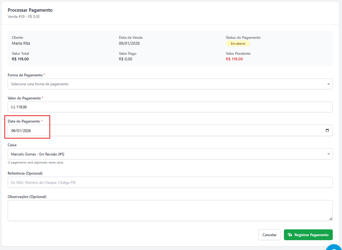 O sistema só permitirá registrar pagamentos em caixas que estejam abertos ou disponíveis na data escolhida.