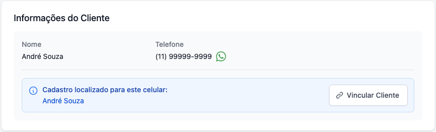 Caso o sistema identifique que já existe um cliente cadastrado com o celular informado no pedido, será sugerido a vinculação do cadastro existente ao pedido.