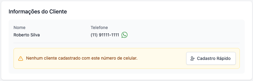 Caso não haja nenhum cliente cadastrado com o celular informado no pedido, o sistema irá sugerir que seja cadastrado um novo cliente.
