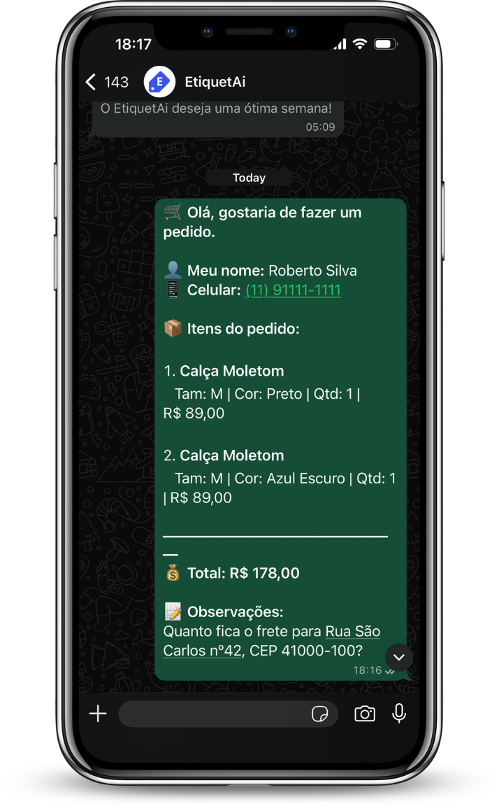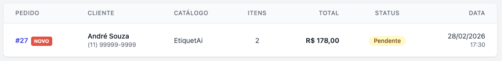 Como havia mencionado acima, seus clientes podem fazer pedidos diretamente pelo catálogo. Além de recebê-los no WhatsApp da loja, através do contato do seu cliente, o pedido também ficará registrado no EtiquetAi, possibilitando que você visualize e gerencie.
