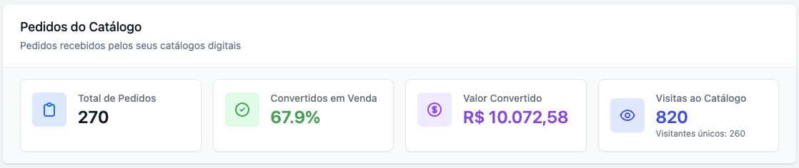 Já este indicador exibe a quantidade de acessos que o seu catálogo teve no período. O número principal refere-se a quantidade total de acessos. Abaixo do número principal, você terá a informação de "Visitantes únicos", que mede quantos visitantes únicos o catálogo teve.