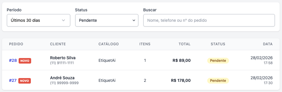 No EtiquetAi, os pedidos podem ser visualizados através do menu "Catálogo digital > Pedidos".