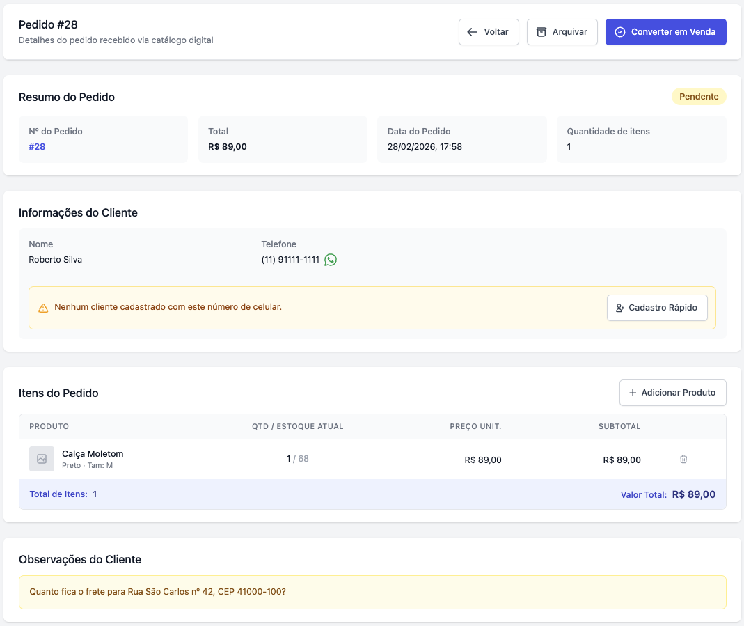 Para facilitar a identificação de pedidos que se transformaram em vendas, o sistema registrará automaticamente uma observação na venda "Pedido do catálogo #ID".