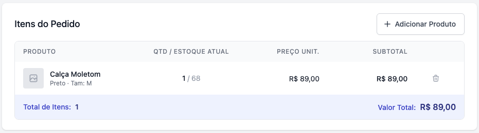 Todas as alterações nos produtos do pedido podem ser feitas pela área de "Itens do pedido".