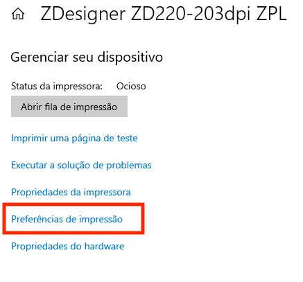Inicialmente, acesse a lista de Dispositivos e impressoras no Painel de controle do Windows para localizar a impressora Zebra ZD-220. Ao localizá-la, clique sobre ela para acessar as Preferências de impressão: