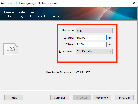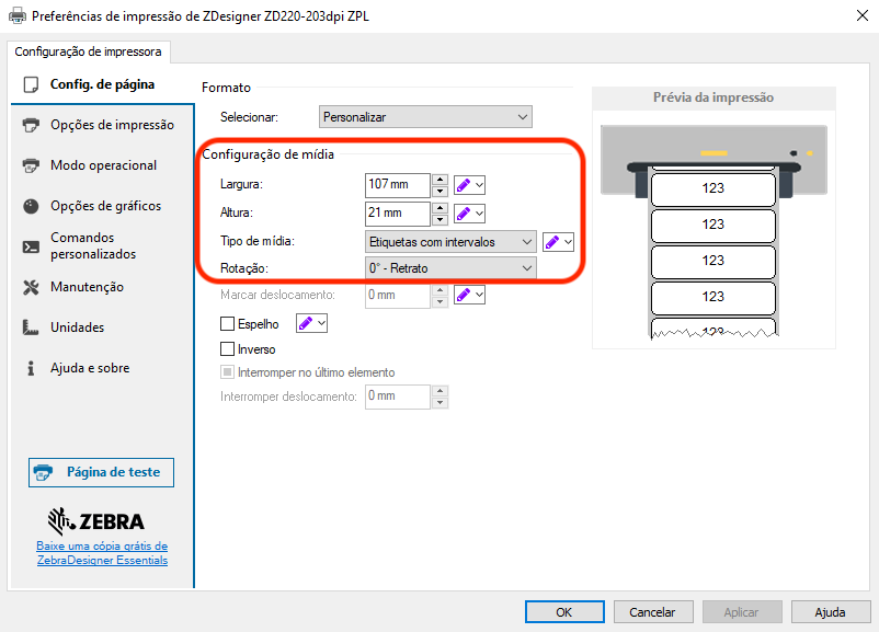 Modo de impressão: Térmico direto se a sua etiqueta é SEM ribbon ou Transferência térmica se a etiqueta é COM ribbon.