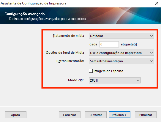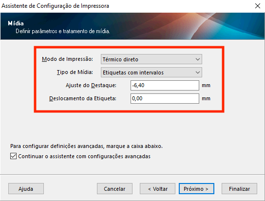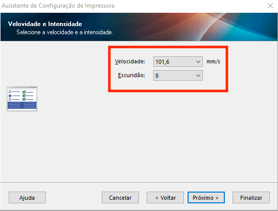 Neste passo, você pode manter o padrão da impressora e ajustar caso necessário a velocidade e a escuridão para deixar as etiquetas mais nítidas.