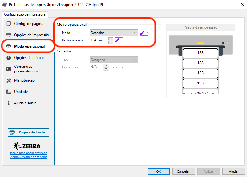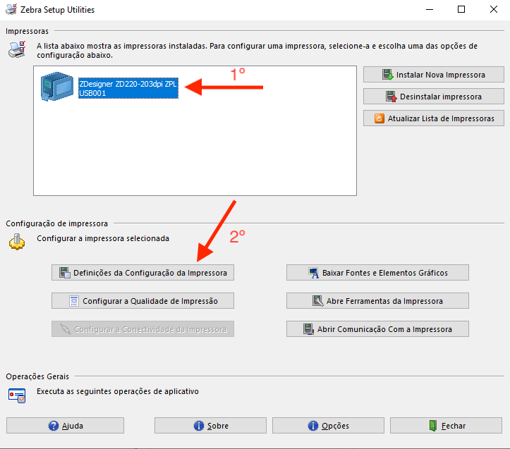 Configuração da impressora através do Zebra Software Utilities